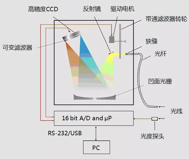 機(jī)械掃描式光譜儀通常由單色儀、光電倍增管探測(cè)器、數(shù)據(jù)處理系統(tǒng)等幾部分組成。其特點(diǎn)是測(cè)量精度高,但儀器龐大,結(jié)構(gòu)復(fù)雜,掃描時(shí)間較長(zhǎng)。主要用于各種高精度光色測(cè)量領(lǐng)域,不適合測(cè)量對(duì)時(shí)間敏感的光源或其他快速測(cè)量應(yīng)用。
