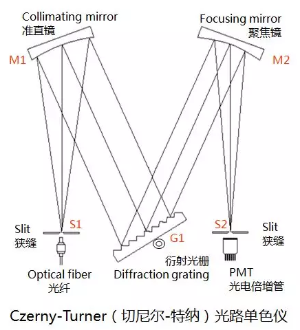 單色儀的光路如下圖所示,光源或照明系統(tǒng)發(fā)出的復(fù)合光線經(jīng)光纖引導(dǎo)至入射狹縫并投射到準(zhǔn)直反射鏡上,經(jīng)準(zhǔn)直反射鏡將發(fā)散光變換為平行光束再照射到衍射光柵,利用每個(gè)波長(zhǎng)離開(kāi)光柵的角度不同,由聚焦反射鏡再把某一波長(zhǎng)的單色光反射到出射狹縫,光電倍增管(PMT)就可以測(cè)定這個(gè)波長(zhǎng)的數(shù)值和強(qiáng)度。光柵在步進(jìn)電機(jī)的帶動(dòng)下勻速轉(zhuǎn)動(dòng),出射狹縫就可以得到不同波長(zhǎng)的單色光,通過(guò)同步讀取光柵角度和光電倍增管的輸出信號(hào),就可以得到復(fù)合光的全部光譜信息。