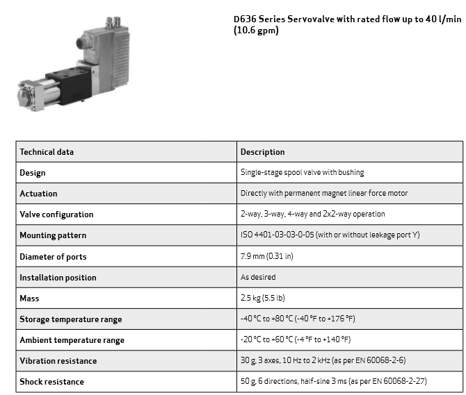 穆格公司已生產(chǎn)伺服閥和伺服比例、集成電子閥等有30多年的歷史,moog閥適用于各類機(jī)應(yīng)用程序的使用。MOOG伺服閥D636-D637系列屬于直動(dòng)式伺服控制閥,可應(yīng)用于三通、四通和2*2通的節(jié)流型流量控制閥。適用于電液位置、速度、壓力或力控制系統(tǒng)以及其他需要高動(dòng)態(tài)響應(yīng)的系統(tǒng)。D636-D637系列伺服閥無需先導(dǎo)油源,通過具有高驅(qū)動(dòng)力的永磁式線性力馬達(dá)直接驅(qū)動(dòng),具有電氣零位調(diào)節(jié)功能,當(dāng)斷電或電纜損壞或緊急停車時(shí),閥芯會(huì)無需使用外力自動(dòng)返回到其彈簧對(duì)中位置。伺服閥直線力馬達(dá)具有高力范圍內(nèi)提供無流量限制,直接驅(qū)動(dòng)的設(shè)計(jì)意味著壓力無關(guān)的動(dòng)態(tài)性能,低電流消耗和近零液壓,集成的數(shù)字電子很靈活性,現(xiàn)場(chǎng)總線接口高等級(jí)。